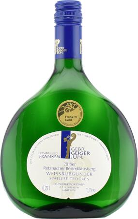 DLG-Silber Unsere Weißburgunder Spätlese trocken begeistert durch Fülle und Finesse mit klaren, feinbeerigen und floralen Aromen. Der Weißburgunder zeigt eindrucksvoll das große Potenzial dieser Rebsorte. Der Retzbacher Benediktusberg, einer unserer Top-Lagen, zeichnet sich durch den Muschelkalk und die damit verbundene Mineralität aus. Bild weicht vom Original ab.