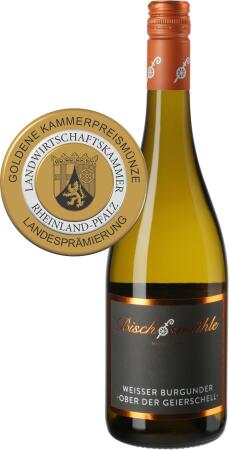 Die 15 Jahre alten Reben von diesem Weißen Burgunder wachsen auf kalkhaltigen, steinigen Böden des Nieder-Olmer Klosterbergs in der Lage "Ober der Geierschell". Flachbogenerziehung für eine gerade Traubenlinie, die einfacher zu bearbeiten ist, grüne Lese und entblättern der Traubenzone tragen zur Ertragsreduzierung und Qualitätssteigerung bei. Die Trauben werden per Hand gelesen und nur die vollreifen ausgewählt. Das Lesegut wird leicht angequetscht und für 48 Stunden mazeriert, um die feinen Sortenaromen aus den Beerenhäuten zu lösen. Danach wird die Maische mit einer pneumatischen Kelter gepresst. Daraufhin werden 2/3 des Mosts im Edelstahltank ausgebaut und 1/3 des Mosts wird im kleinen Holzfass spontan vergoren. Die lange Lagerung auf der Feinhefe (sur lie) kennzeichnet den Charakter unseres Weißen Burgunders, so entwickelt sich das außergewöhnliche Reifepotenzial. Das Ergebnis ist ein Weißer Burgunder voller Struktur mit einer rassigen und geradlinigen Rebsorten Typizität.